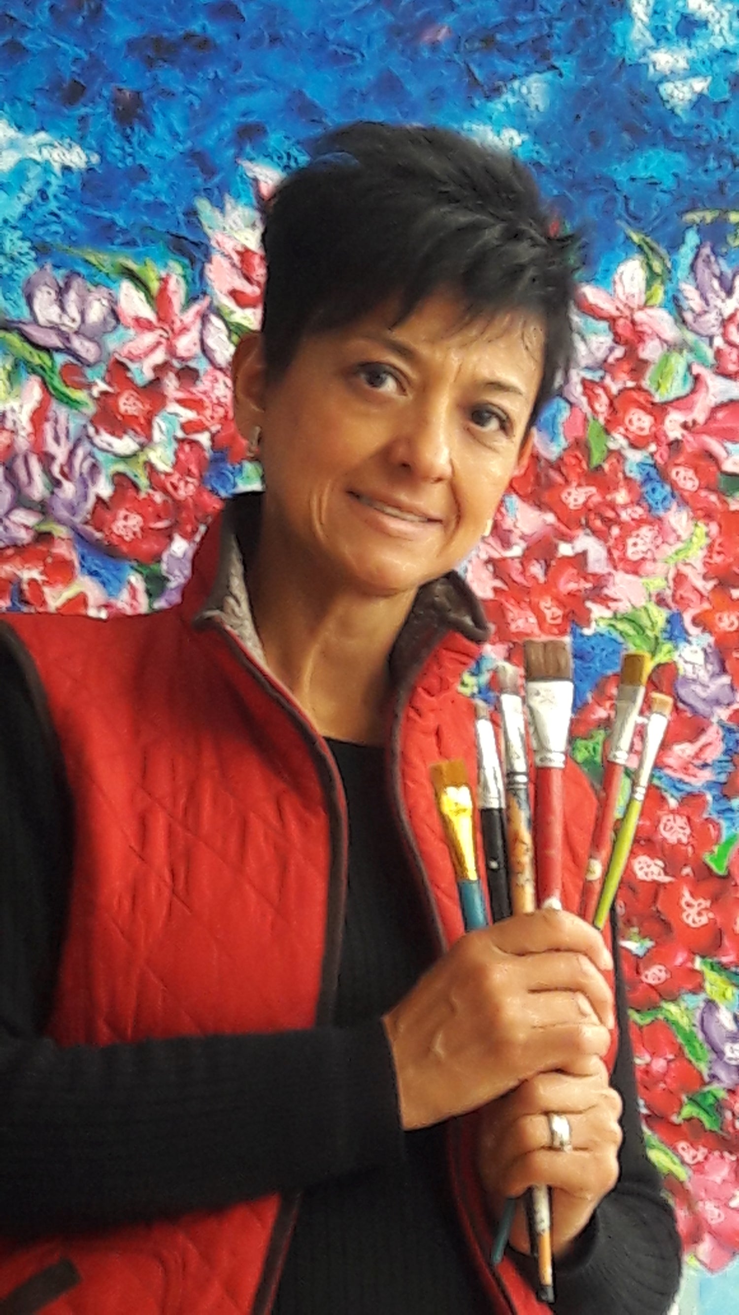 With a background as a textile designer for 17 years, Olga created vibrant textile collections for women's fashion. Transitioning into the realm of visual arts over 15 years ago, she has since cultivated a remarkable career as a plastic artist, producing a diverse array of works. She currently creates and produces art in her home studio, where she also teaches modern painting to a group of students.